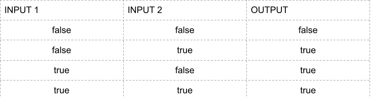They are the ‘inclusive or’ and ‘exclusive or’ gates. They both have two inputs and are very similar, but they have a differant output when both inputs are true. The ‘inclusive or‘ gate, or just or gate, as it is the more common, has the following truth table: