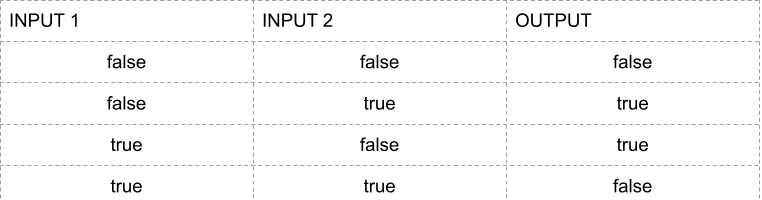 As you can see, it is true as long as at least one input is true. This is in contrast to the ‘exclusive or’ gate, or xor gate for short, which is true if only one of its inputs is true, as you can see from the following truth table: